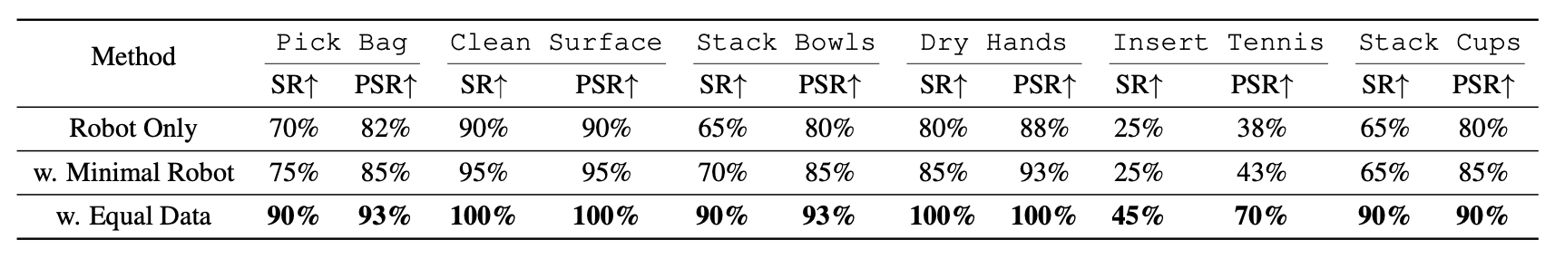 Quantitative Results Across Three Training Setups. SR and PSR for a Robot Only baseline (20 robot data), w. Minimal Robot trained primarily on synthesized data (20 human-to-robot data + 3 robot data), and w. Equal Data using a balanced mix (20 human-to-robot data + 20 robot data).