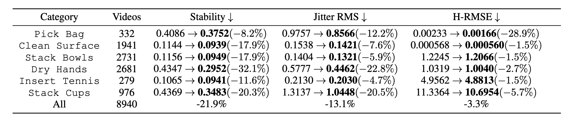 Per-category, frame-weighted means. “↓” lower is better; “↑” higher is better. Cells show {before} → after (relative Δ%).
