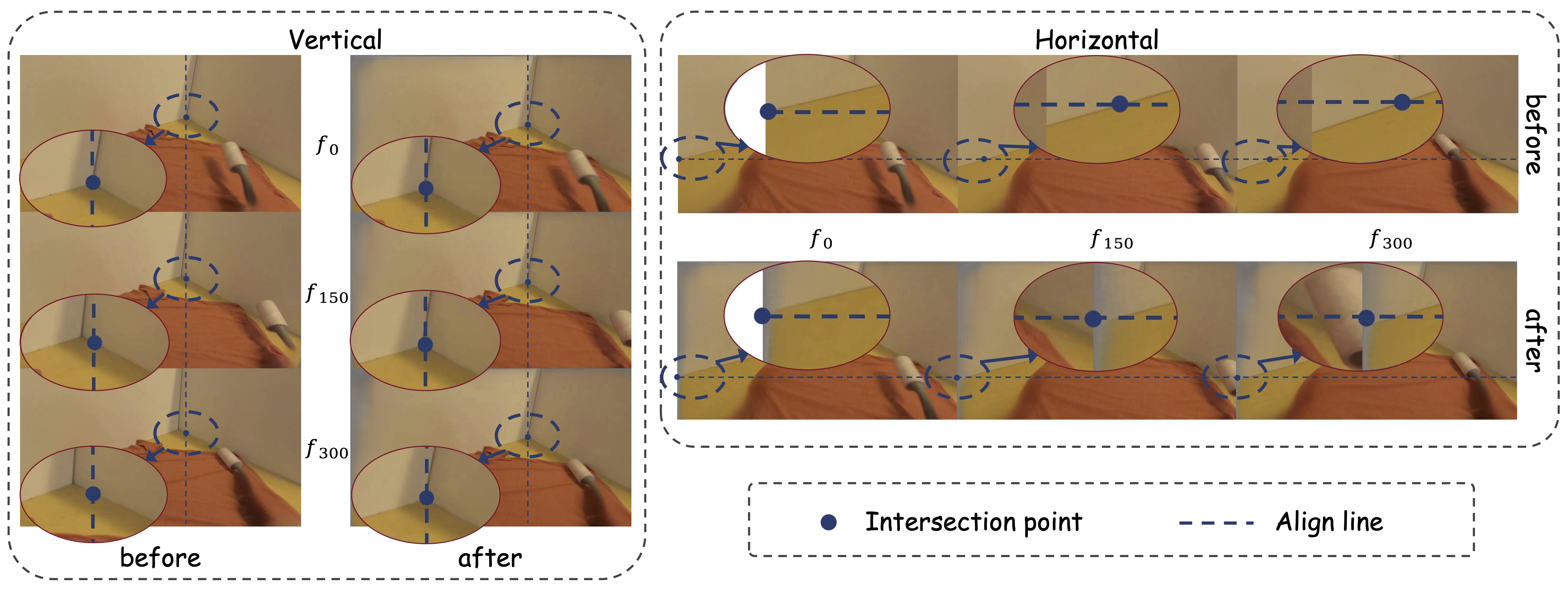 Qualitative evaluation of EgoStabilizer. On a 300-frame Clean Surface video, frames at indices 0, 150, and 300 are shown before and after stabilization. Keypoints such as wall corners and table–image intersections exhibit large jitter in the original video, whereas the stabilized outputs show negligible displacement, confirming effective viewpoint stabilization.