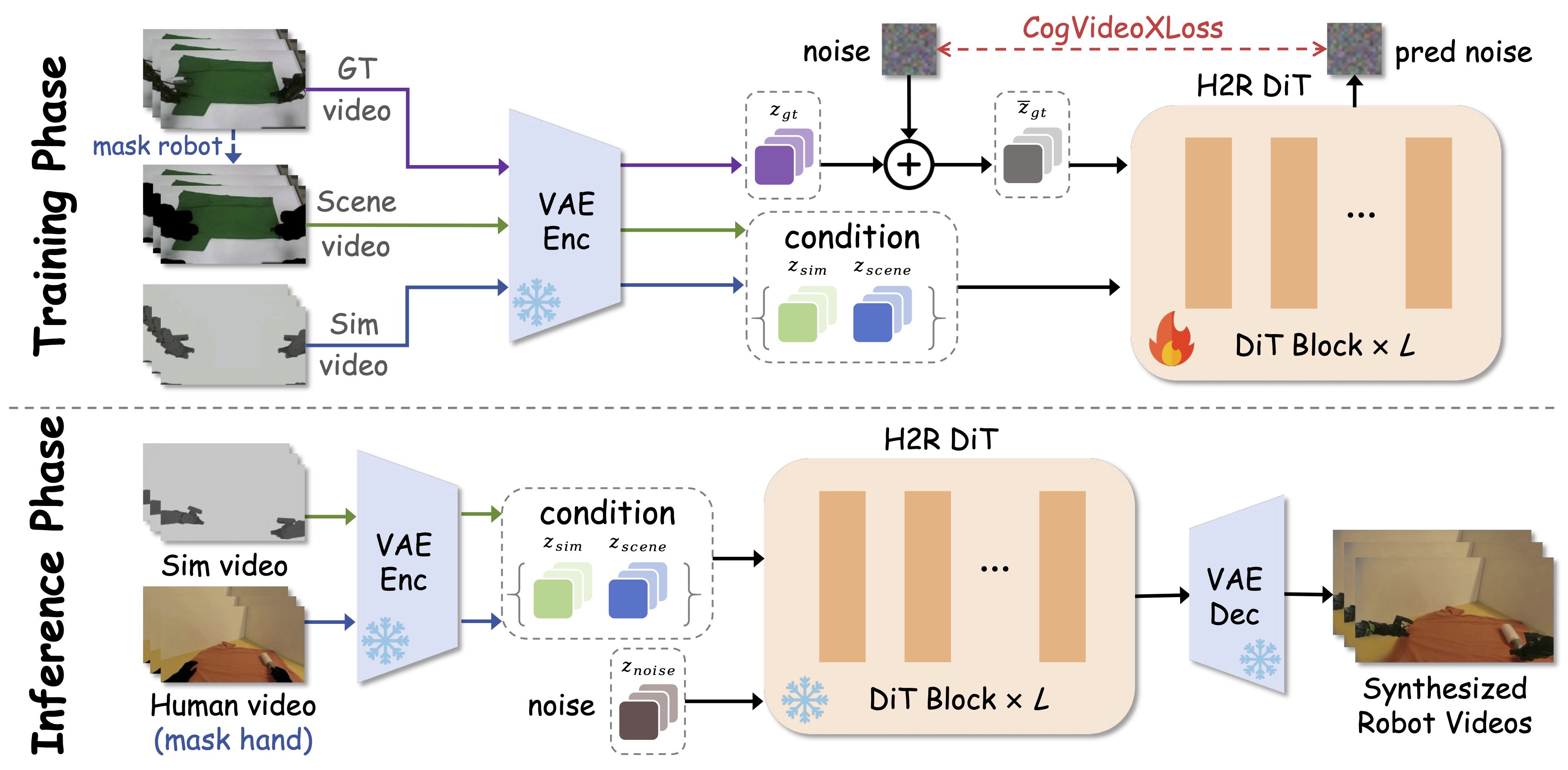 H2R Aligner. During training, the real robot video Vgt, background Vscene, and simulated foreground Vsim are encoded by a frozen VAE and channel-concatenated as [z̃tar, zscene, zsim] before entering the trainable H2R DiT, optimized with CogVideoXLoss loss. During inference, a hand-masked human background and IK-replayed simulation serve as conditions; the target starts from noise, is denoised by H2R DiT, and decoded by the frozen VAE into synthesized robot videos.