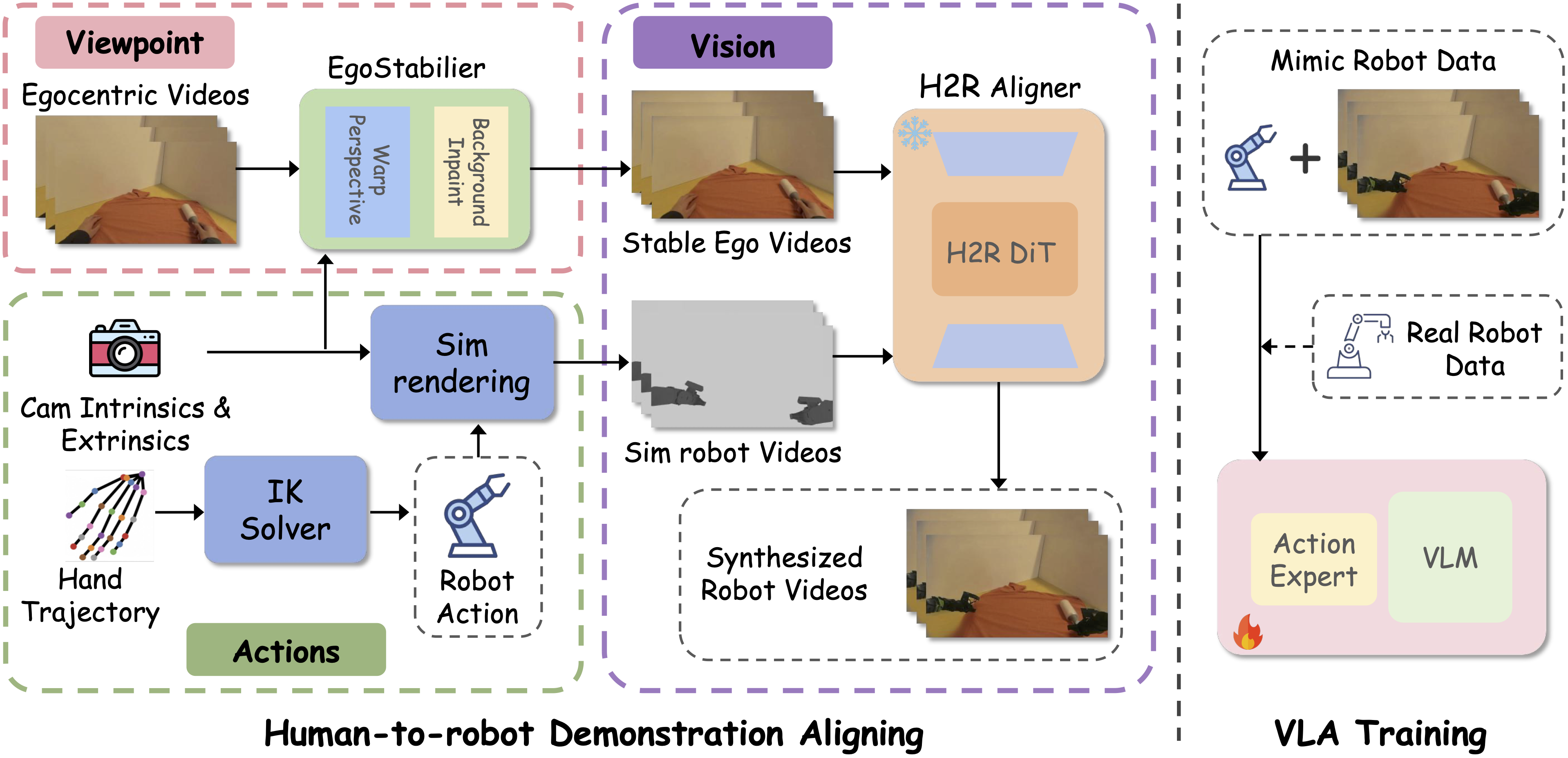 Overview of MimicDreamer. Viewpoint branch (top left): egocentric videos are stabilized by EgoStabilizer (warp perspective + background inpainting) to produce stable egocentric videos. Camera intrinsics/extrinsics and the robot URDF drive sim rendering to generate additional stable ego views. Action branch (bottom left): 3D hand trajectories are converted to robot actions with IK solver. Visual alignment (right): H2R Aligner learns to bridge the human-to-robot visual gap using stable egocentric videos and simulation robot videos. The resulting synthesized robot videos and robot actions are used for VLA training.